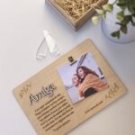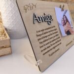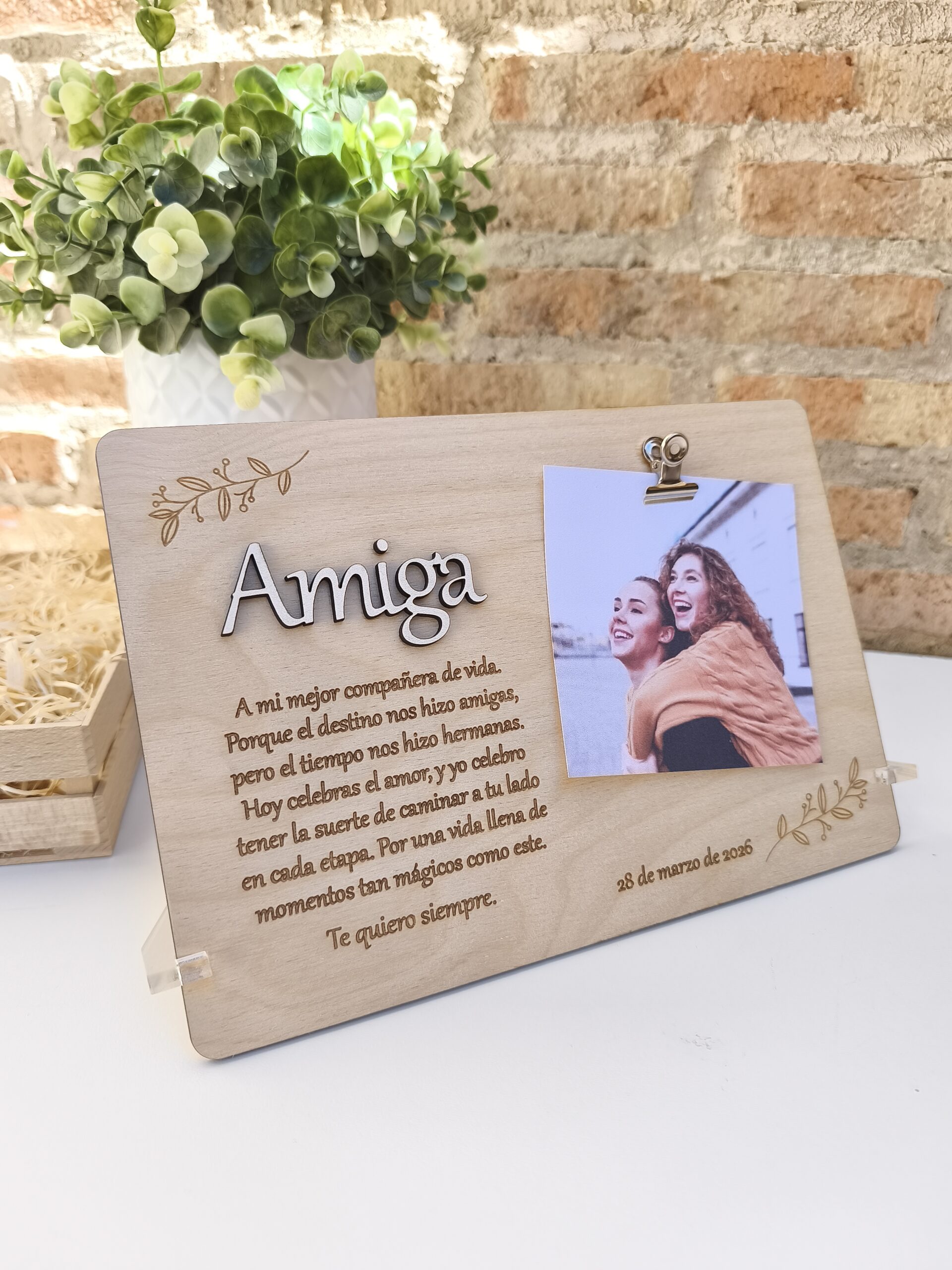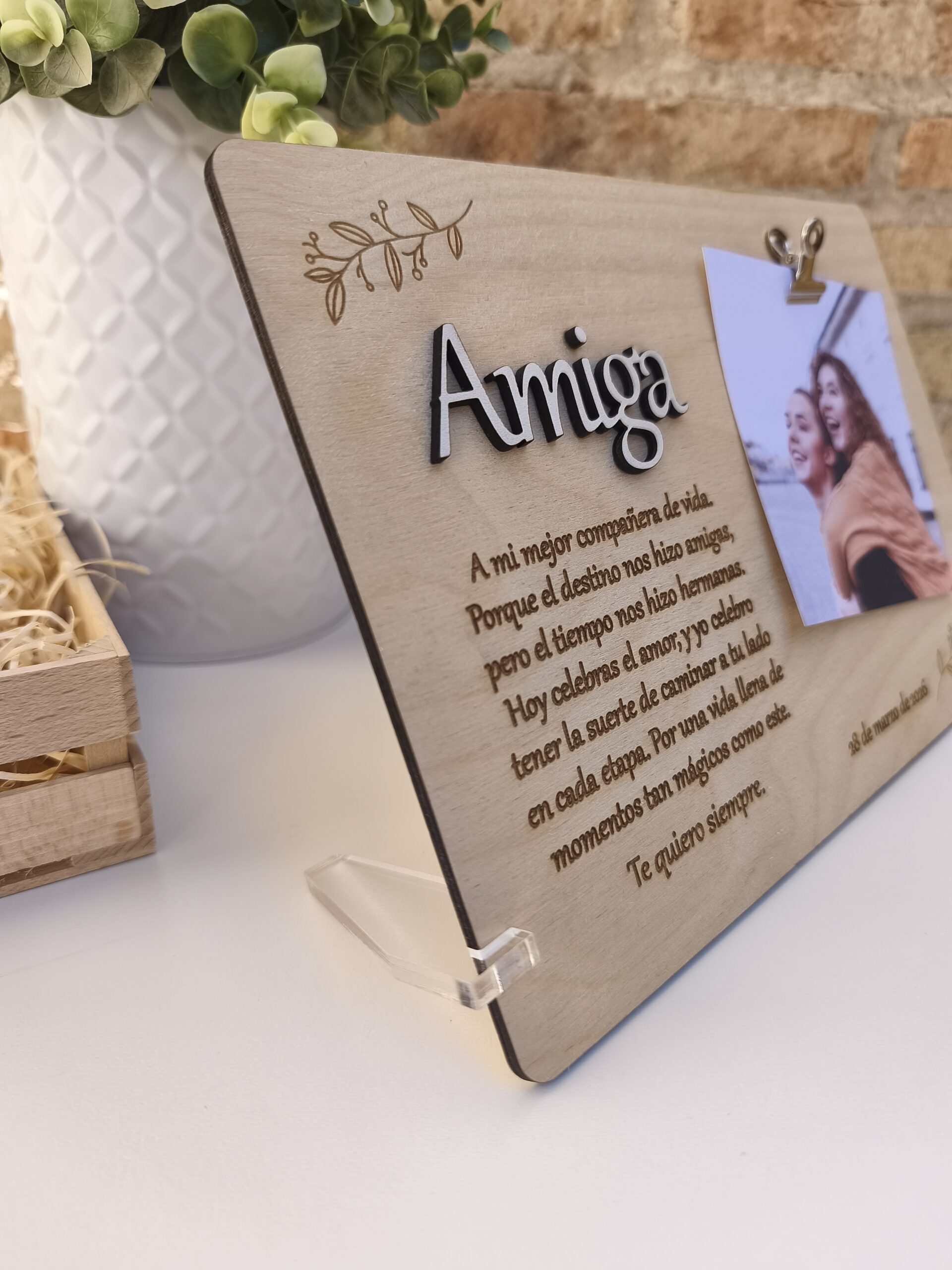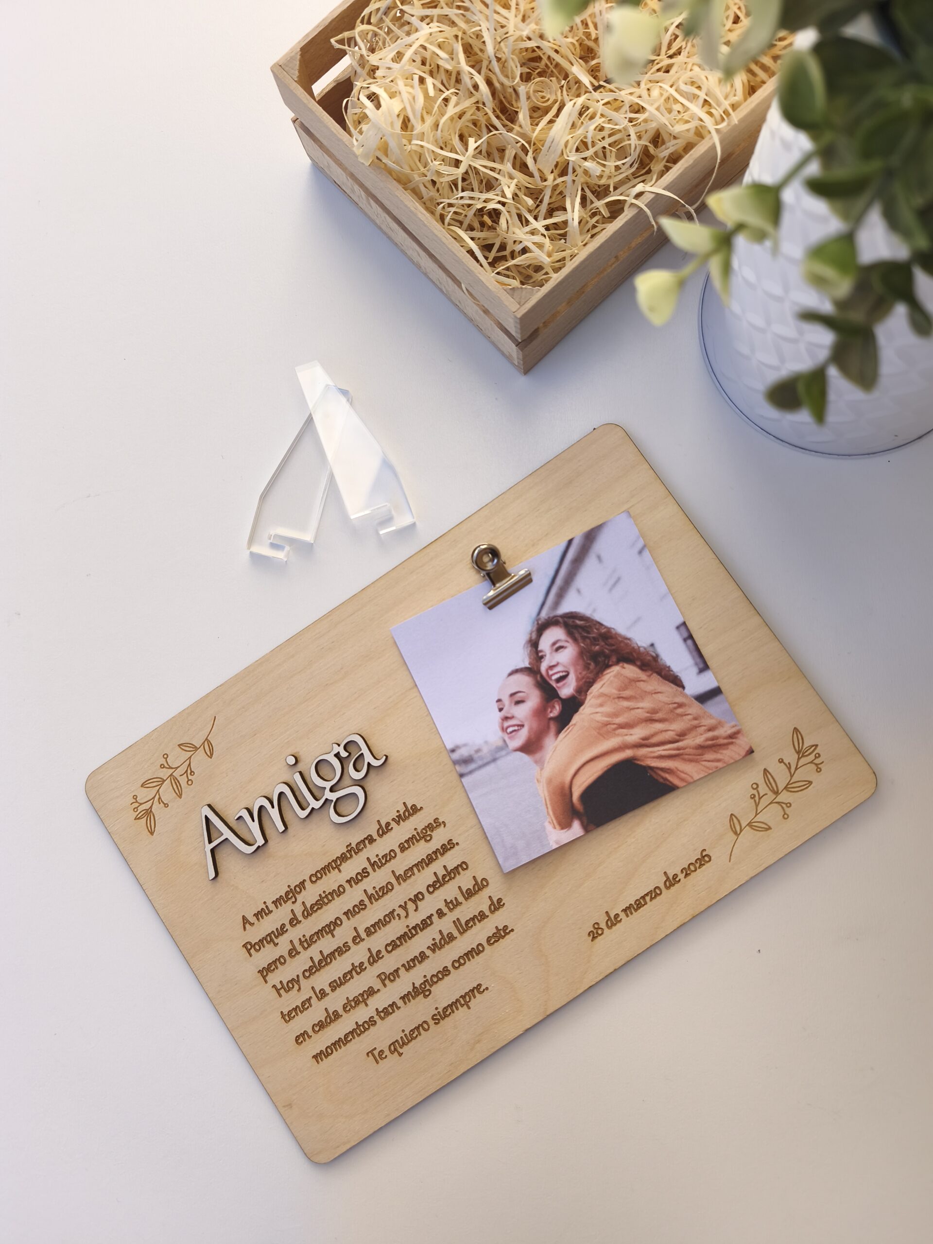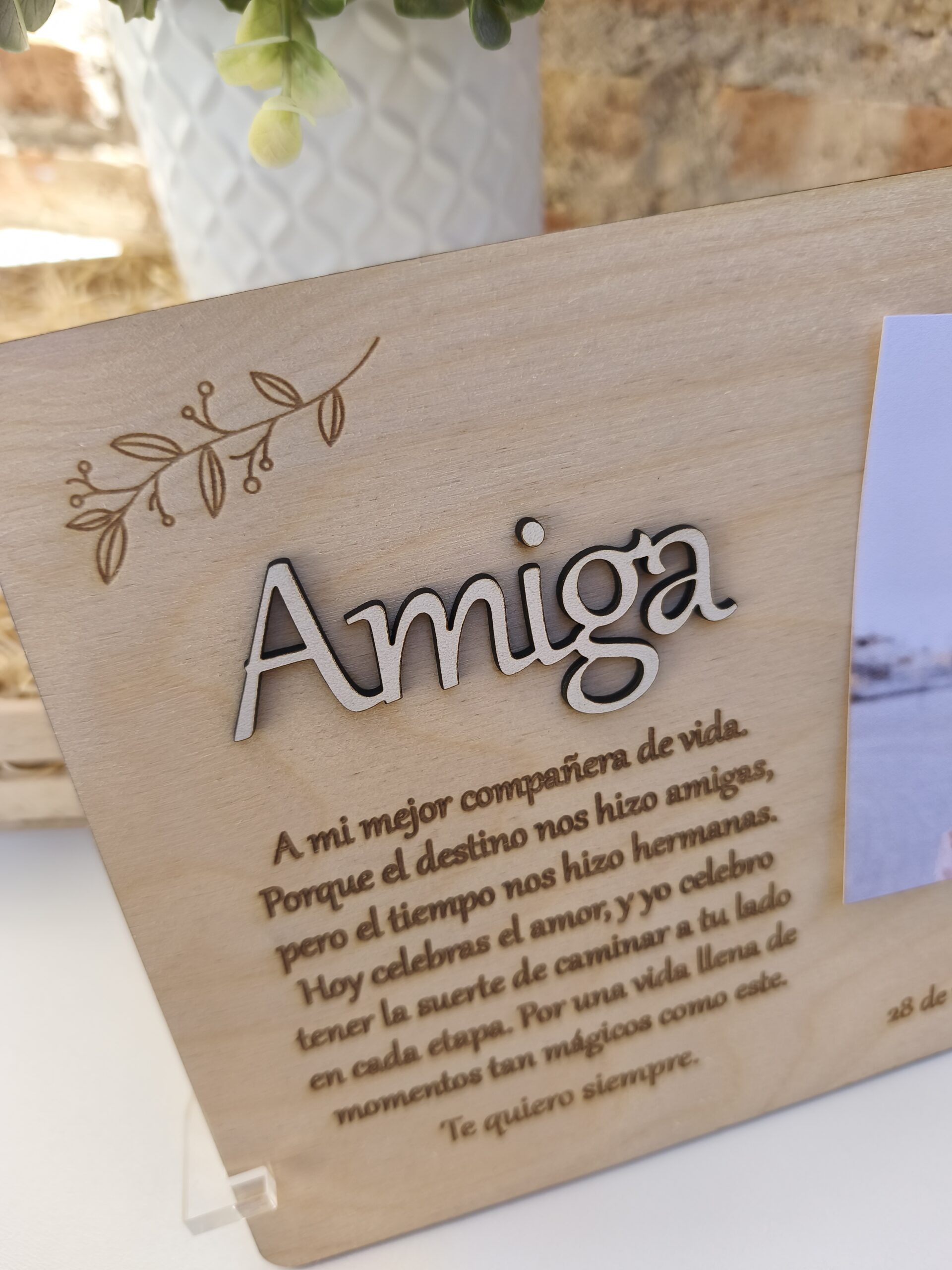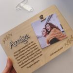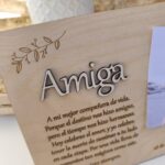 Título en relieve (como “Amiga”, “Mamá”, “Papá”) cortado a láser con tipografía elegante.